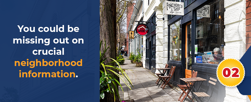 Without a realtor, you're going through this journey with no neighborhood specialist to rely on. Sure, you can and (actually need to) research vital information such as school districts, zoning codes, crime rates, local trends, current market values, etc. But local real estate agents will be able to tell you more about those things, and give you reputable data and other facts about the neighborhood you're considering. They probably even know the best coffee shops or restaurants in town, making them the best resource if you want to familiarize yourself in your potential neighborhood.