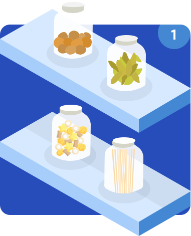 Just choose the essential items to transfer into large, clear containers, such as rice or pasta, so you can better keep stock of your inventory. Other items, such as snack foods, are better left in their original packaging to be arranged in baskets. Just eliminate their outer box to save more room in your storage.